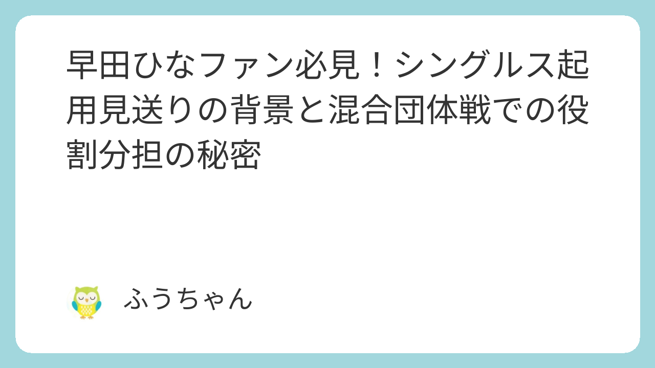 この新しい考え方により、早田ひな選手は「ダブルスのエキスパート」として最大限活用され、チーム全体の戦力向上に大きく貢献したと考えられます。